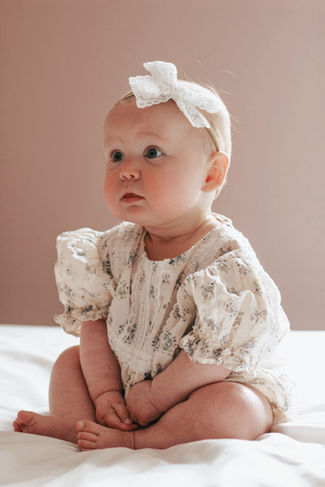 3–4 months - At this age, babies are often content on their back or tummy, beginning to lift their heads and explore the world around them. Sessions capture soft, early expressions, tiny stretches, and quiet moments of connection.